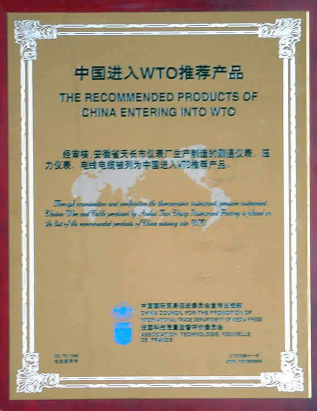 安徽省天長(zhǎng)市儀表廠生產(chǎn)制造的測(cè)溫儀表、壓力儀表、電線電纜被列為中國(guó)進(jìn)入WTO推薦產(chǎn)品