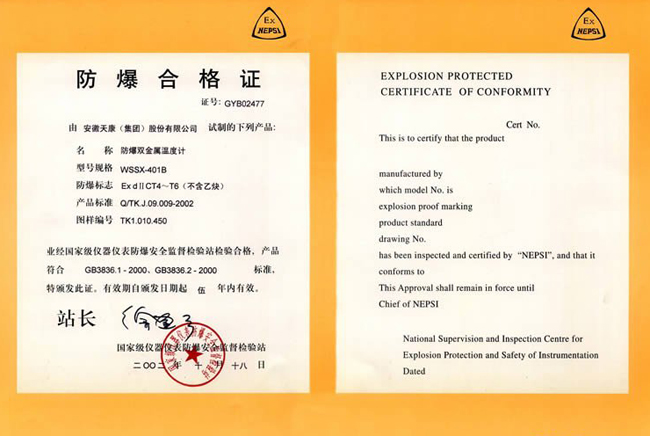 防爆雙金屬溫度計(jì)領(lǐng)取了由國(guó)家級(jí)儀器儀表防爆安全監(jiān)督檢驗(yàn)站出具的防爆合格證2